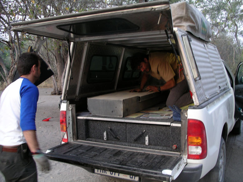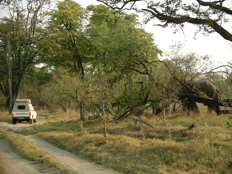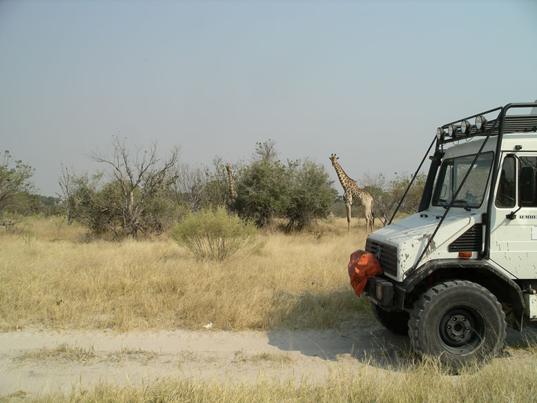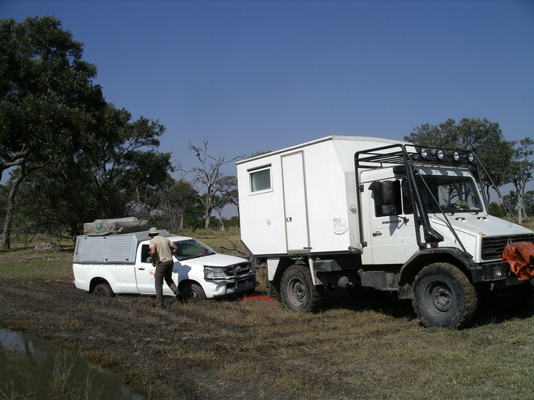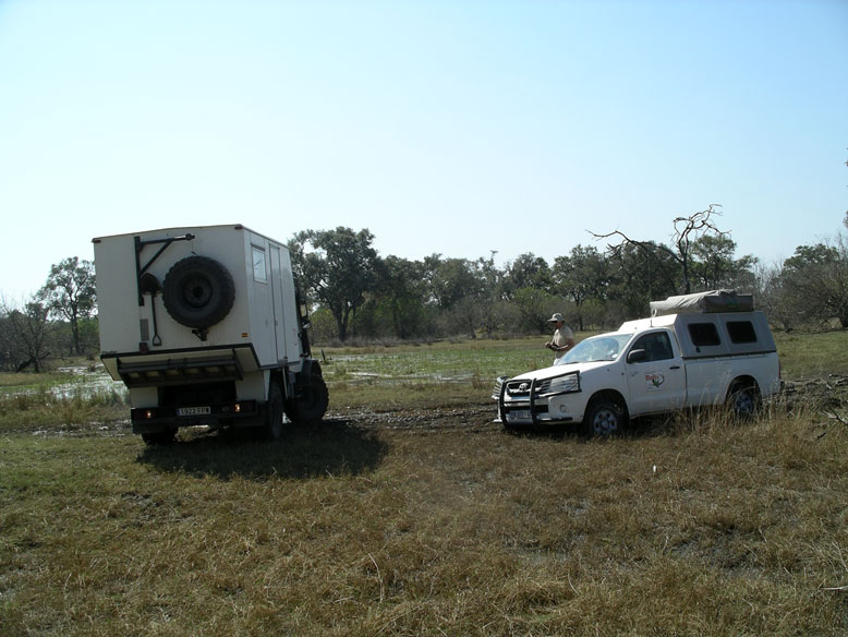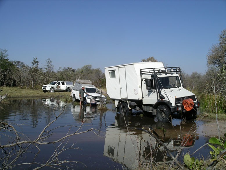 La entrada a la reserva se hace desde dos puertas, la norte y la sur. Nosotros optamos por la norte pero nos fue casi imposible acceder por ella. Había sido el año más lluvioso en treinta años y lo que iba a ser un viaje de placer se convirtió en un camel trophy. La pista principal que accedía a la puerta norte estaba totalmente inundada. Intentamos buscar diferentes pasos, pero solo el Unimog era capaz de pasar por sus cualidades offroad. El todo terreno que conducía Fran, no lo conseguía. Había pasos donde el agua llegaba al metro y medio de profundidad, y el Unimog parecía un auténtico submarino. Cuando ya lo íbamos a dejar por imposible apareció un lugareño que nos indico un posible paso. Y el paso lo hicimos, pero tuvimos que medir primero la profundidad descalzandonos y luego tirar del todo terreno con el motor parado por si pudiese ingerir agua por la admisión.