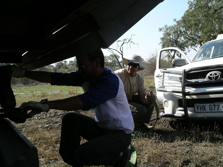 Debido aun error en el calculo de combustible y al trajín buscando los pasos correctos tanto dentro como fuera de la reserva, me quede sin el combustible necesario para llegar al próximo punto de abastecimiento que era Kasane. Intentamos transvasar combustible del Toyota, pero la bomba era muy lenta, así que al final, quitamos el deposito auxiliar del uni, y nos fuimos a Maun a por agua y combustible con el toyota.