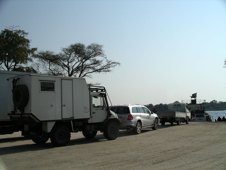 Cruzar la frontera de Zambia no es una cosa sencilla. Ademas de ser corporativamente compleja, es carisma. Suele coincidir que los países con la renta peri capita más baja del planeta suelen ser los más caros a la hora de atravesar sus fronteras. Lo primero que uno se plantea es por qué no existe un puente que conecte Botswana con Zambia y el cruce del río Ameché se tenga que realizar por medio de dos viejos transbordadores que parecen que les tienes que pagar tu a los del desguace para que se los lleven. La única razón que se me ocurre es el lucrativo negocio que tienen montado con tal servicio. En notas de viaje os explicaré al detalle los costes del paso de esta frontera con un vehículo, para que veáis del disparate del que se trata.