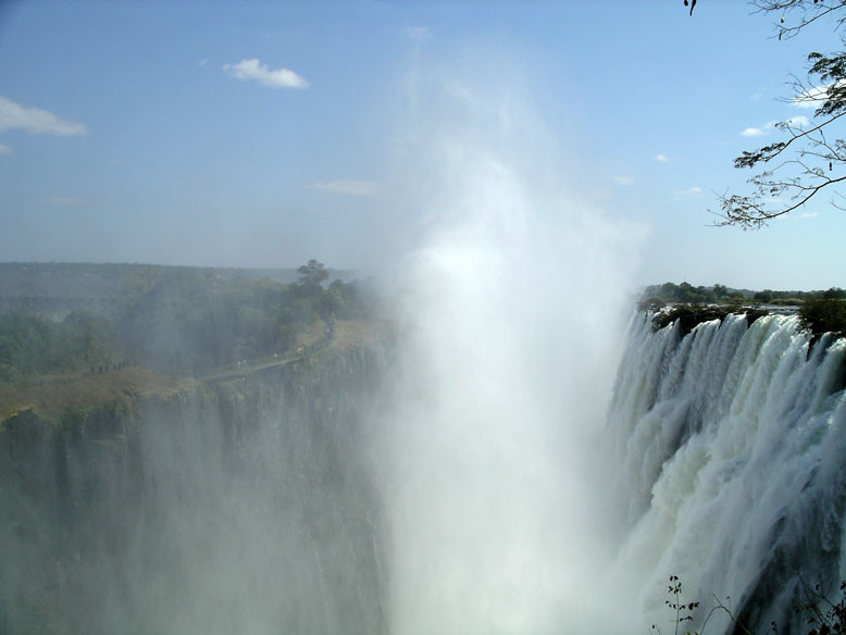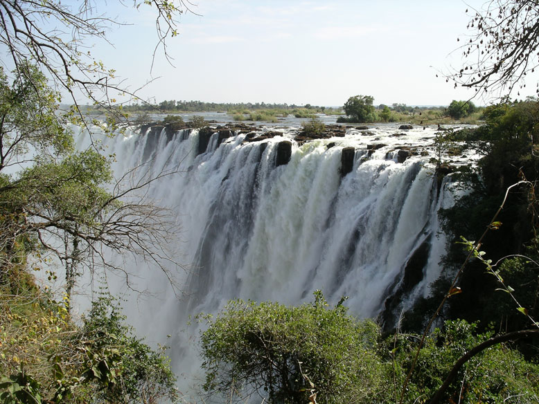 Las cataratas victoria estan a un tiro de piedra de la ciudad. Es un espectáculo majestuoso incluso más impresionante si cabe que las de Iguazú. Estos son sus datos extremecedores 1,7 km de anchura, 108 mts de altura y un caudal medio de un millón de litros por segundo. En época de lluvias simplemente no te puedes ni acercar del caudal y el spray que despiden. Es mejor verlas en la época seca, aunque el caudal sea ligeramente menor. Nosotros aún coincidiendo con la época seca, hemos pillado un año muy lluvioso y traían mucho agua. Esto nos impidió verlas desde la mismisima isla de quien las descubrió para occidente, David Livingston que escribió en su diario " Imágenes tan bellas como esta deben de hacer que los ángeles miren desde lo alto". Si bien Livingston las bautizó como Victoria en honor a su reina de Inglaterra su nombre original es Mosi-oa-Tunya que en kokolo viene a significar "el humo que ruge". De hecho, el parque se llama con ese nombre aunque las cataratas sigan conservando el nombre de Victoria.