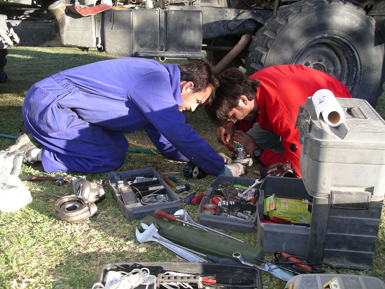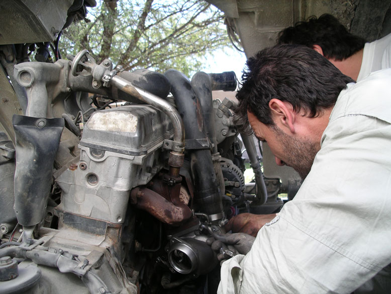 Despues de salir del Ethosa tomamos la carretera que nos lleva al pueblo de Khorixas. Hay un punto interesante en lla ruta que se llama el paraje de Vingerklip. Es como si estuvieses en el Monumental Valley de Arizona, esperando el paso de la diligencia ...y de verdadad pasan. Pasado Khorixas termina ya el asfalto y empiezan las interminables pistas de tierra, que nos cruzarán Nabimia de Norte a Sur. Desde Khorixas sale la pista que te lleva a una de las entradas autorizadas de la costa de los esqueletos, la puerta de Springbok. Fue nada más tomar esta pista cuando un fuerte sonido chirriante y una bocanada de humo, nos hizo parar inmediatamente el Uni. Por suerte esta vez no estábamos solos, pues nuestros amigos Fran y Elena seguían con nosotros. El turbo se había quedado practicamente gripado. Un problema serio se nos avecinaba. Eran las 2 de la tarde cuando se produce la avería. Poco a poco podemos llegar al pueblo y quedarnos en su camping para empezar a plantearnos la solución al problema, pues este vehículo sin turbo debido a su electrónica no funciona. LLamamos al servicio Mercedes de la capital, Windhoek. No tienen el turbo, lo tendrían que pedir a Alemania y tardaría 30 días. No nos vale la solución. Llamamos a mi hermano para que mire en la Mercedes de Madrid. Su respuesta es casi la misma, el turbo no lo hay en España y llegaría en una semana de Alemania más luego el tiempo que tardara en llegar a Johanesburgo. Tampoco es viable esta solución. Por ultimo recurso, llamamos a la Mecedes de Johanesburgo. Lo mismo, hay que pedirlo a Alemania. Tardaría unos 20 días. Tampoco es viable. Ya empezamos a ver las cosas bastante negras. Creo que el viaje se acaba de momento. El de la Mercedes de Johanesburgo se queda con mi telefono y a las dos horas me llama. Sorpresa!!!! Ha encontrado un turbo, que no es exactamente como el mío pero si corresponde al mismo tipo de motor. Es concretamente de una Sprinter CDI. Esta en un distribuidor paralelo de Mercedes en Johanesburgo. Sin dudarlo ni un momento nos ponemos con la logística. Cogemos el coche Fran y yo, y nos vamos a Windhoek. 500 kilometros distan desde nuestra posición. LLegamos al aeropuerto a las 11 de la noche, pero a esa hora ya no hay avión para Jnb. Saco el billete para el vuelo de las 07.00h del día siguiente. Vuelo a Jnb y allí me esta esperando mi amigo Mike para llevarme al distribuidor. Allí esta el turbo!!! es muy parecido pero no igual. Que hago me lo llevo, me arriesgo...son 800€ tirados a la basura si no funciona...pero dejar el viaje tirado con mis amigos allí vale más que ese dinero. Así que me traigo el turbo debajo del brazo en el avión de la noche a Windhoek. Allí esta Fran esperandome. Salimos zumbando a Khorixas, donde esta Yaiza, Elena y el Unimog. Esa noche reventamos una rueda de la pick up, en lo que iba a ser un calvario de pinchazos y reventones desde ese momento. LLegamos a Khorixas a las 02.00 de la mañana. A la cama que al día siguiente veriamos si podíamos montarlo o no. A las siete de la mañana siguiente ya estábamos manos a la obra. El turbo en si, es el mismo, pero el del Unimog trabaja por depresión y el de la sprinter por sobrepresión. Tenemos que mover las caracolas para que se queden alineadas con las tomas del Unimog y montar en el turbo nuevo la válvula el actuador de la válvula de alivio del viejo. Taladrar, soldar, medir y finalmente al las 17.00h estaba montado. Eureka!!! funciona y empuja el motor como un jabato. Tengo que reconocer que mi amigo Fran es un auténtico artista en hacer modificaciones para que las cosas funcionen. Han sido muchos años viajando juntos y se perfectamente de sus habilidades y mañas en estos menesteres.