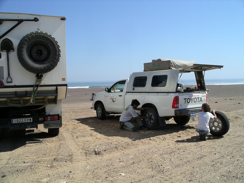 Una vez que llegas a la puerta norte de Springbok, solicitas el permiso de transito hacia el sur, porque al norte esta prohibido, y tienes que salir por la puerta sur, la de Ugabmond, antes de las 15.00h. Esta zona compredida entra ambas puertas, es la zona de reserva. Es impresionante lo bella que es, dunas, salares, barcos oxidados embarrancados en la playa. Estos paisajes me vuelven loco.....pero no todo iba a ser tan idílico, 20 kilometros antes de llegar a la puerta sur, la rueda trasera de la pickup se deforma completamente. Por suerte habíamos comprado una nueva el día anterior. Cambiamos rueda y a 1 kilometro de la puerta, volvemos a pinchar otra rueda. Ahora si que no!!!. Sábado por la tarde y el pueblo más próximo para ir a reparar la rueda esta a 150 kilometros.,Hentiesban. Arreamos Fran y Yo con el Uni, para ver si nos pueden por lo menos arreglar una. Yaiza y Elena se quedan con el coche inutilizado en la puerta sur. Afortunadamente hay un alma caritativa que se ofrece a arreglar una de las ruedas, la otra deformada no tiene arreglo, así que mientras arreglan una nos vamos a 80 kilometros a la ciudad de Swakopmund a comprar una nueva. Llegamos demasiado tarde, todo cerrado. Ya de vuelta a la puerta sur recogimos la rueda arreglada en el Hentiesban y la montamos a la llegada. 500 kilometros recorridos para arreglar una simple rueda. Esto es África!!!