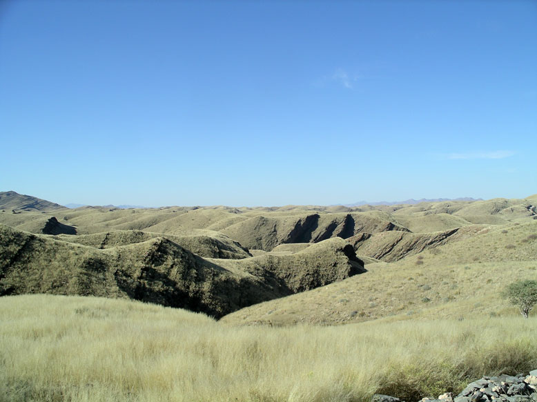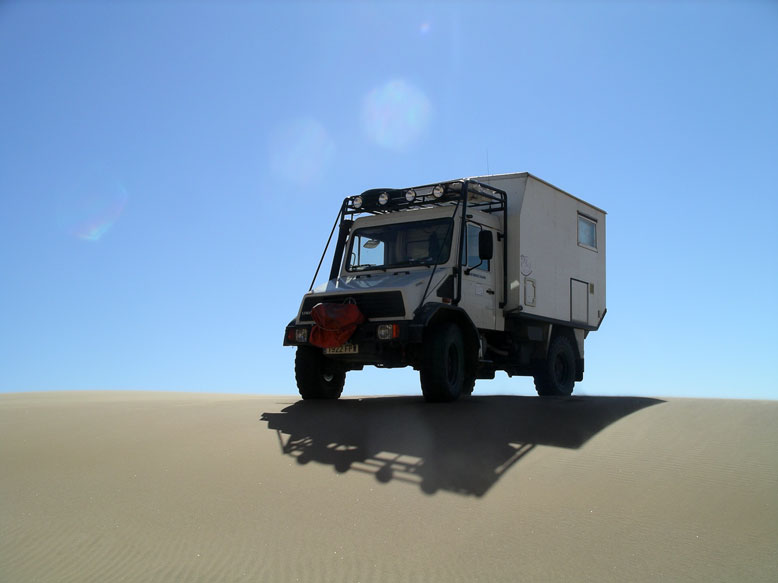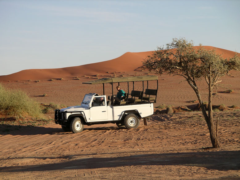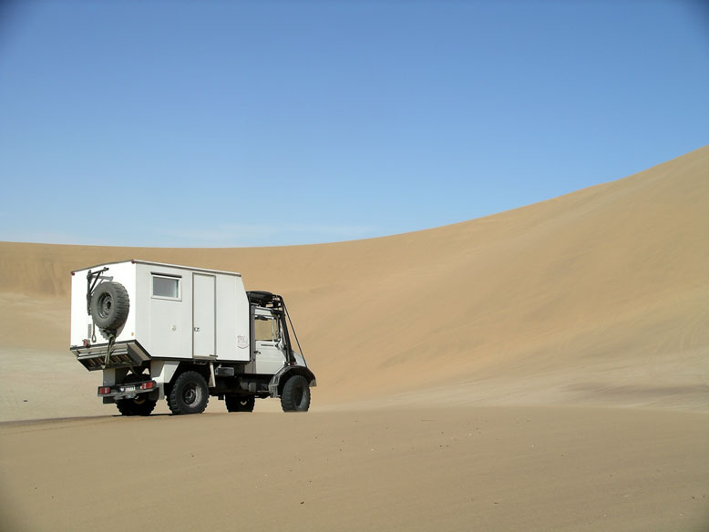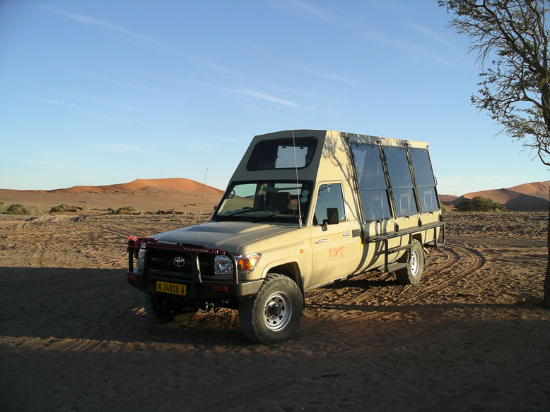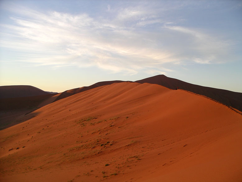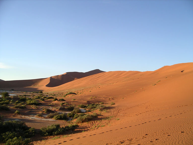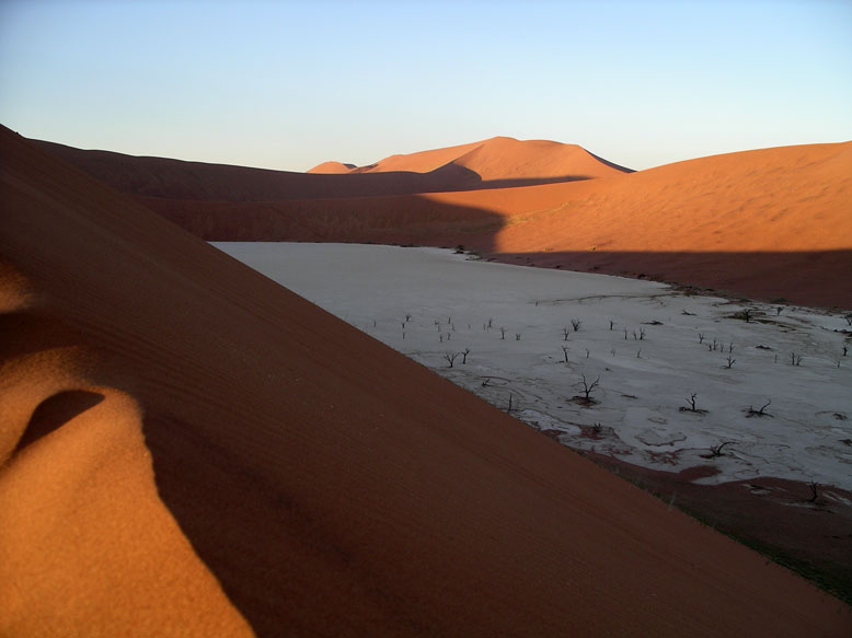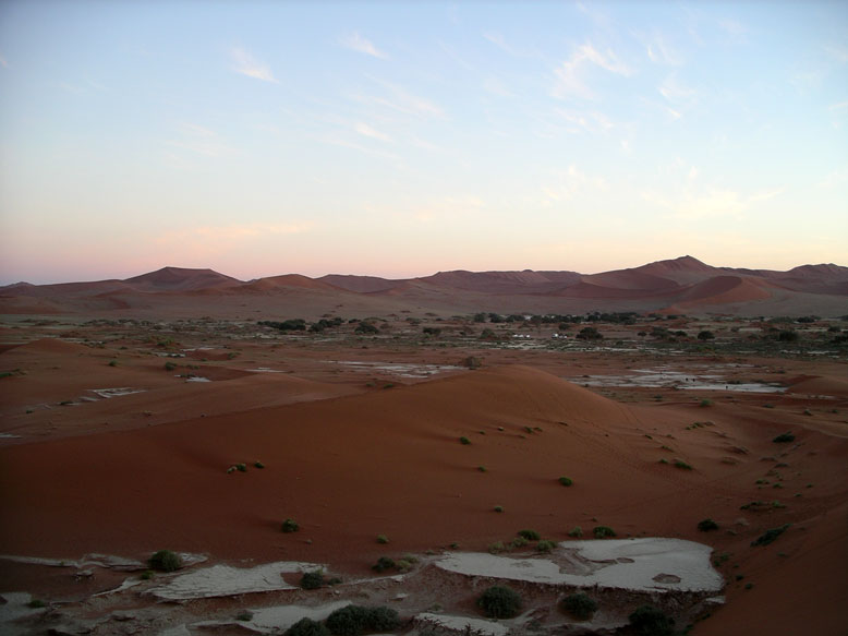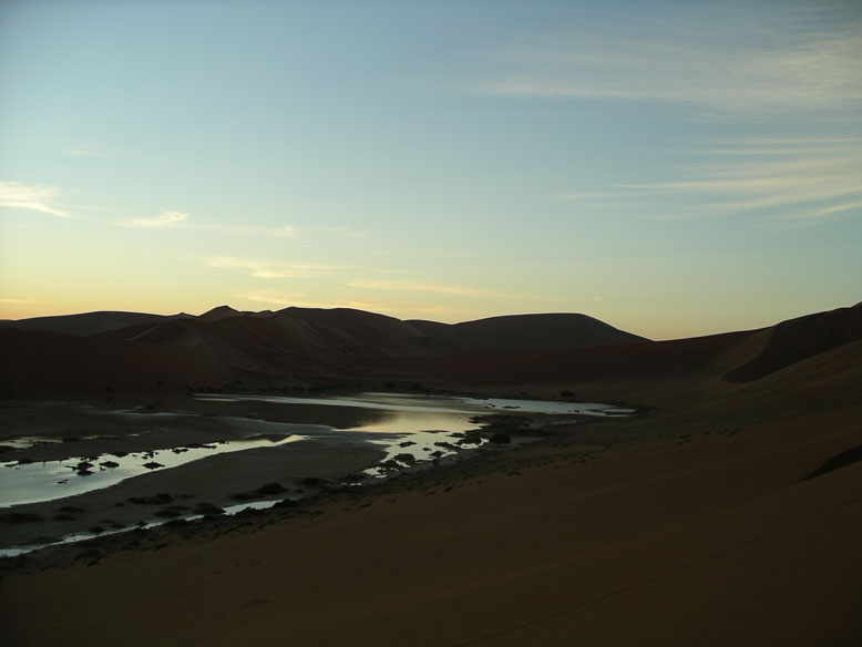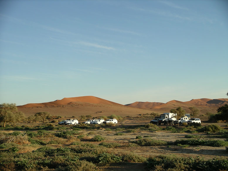 De allí te diriges por la pista c14 hasta la localidad de Solitare, atravesando el atractivo paso de Kulseb. Desde Solitaire ya enlazas con la C19 hasta Sesriem donde empieza el pequeño y gran engaño. En Sesriem esta el campamento de NWR (Namibia wildlife resort), por cierto muy bien montado y donde esta situada la puerta que da acceso a la famosa zona de dunas de Sossuvlei. Lo que más te venden las guías, los tour operadores y todo con el que hablas es que hay que ver la gran duna al amanecer. Bueno pues esa duna dista del campamento 55 kilometros. La puerta del campamento la abrieron ese día a las 05.45 y el orto del sol era a las 0620. A las 05.00 ya estaba la gente haciendo cola en la puerta como si se tratase de una carrera de fórmula 1. Nosotros estuvimos allí a las 05.15 he hicimos turno 4, despues de un todo terreno, un turismo y dos camiones-autobus. En el momento que se abre la puerta y el vigilante de turno registra tu matricula, sale la gente haciendo ruedas. Nosotros íbamos lo que coloquialmente se llama a tabla. 115 km/h. El Unimog no dá más y aún así nos pasaban autobuses, camiones...una locura...Con noche todavía cerrada, a esa velocidad y los animales que había por la carretera. Yo miraba mi hora estimada de llegada en el GPS y me daba justo 4 minutos antes del orto. La mayoría de la gente se paraba para ver el amanecer en la duna 45, pues es el punto donde se termina el asfalto.una verdadera romería, que me expliquen donde esta el encanto. Unos 4 vehículos todo terreno continuamos como locos ya por pista con mucha arena, hasta el punto donde se llega a la gran duna que esta en el enclave de Dead Vlei( laguna muerta). Al final nos bajamos del coche 4 minutos antes del orto, y corre que te corre a subir la duna y ver el amanecer. Que no me cuenten más películas de miedo!!! ni cuentos de las mil y una noche. Una total decepción, he visto amaneceres mucho más increíbles en el Sahara o mismamente en el desierto de Atacama sin montar ese circo que montamos. Si al "guiri" que no ha pisado un grano de arena en su vida le parece la "hostia", pues me parece muy bien, pero ya os digo a los que habéis hecho mucho desierto, que os ahorréis el numerito. Desayunar tranquilamente en el camping o comer y a media tarde os acercáis a ver las dunas. Este circo nos costó entre el camping y el paso por puerta 200N$ por persona.