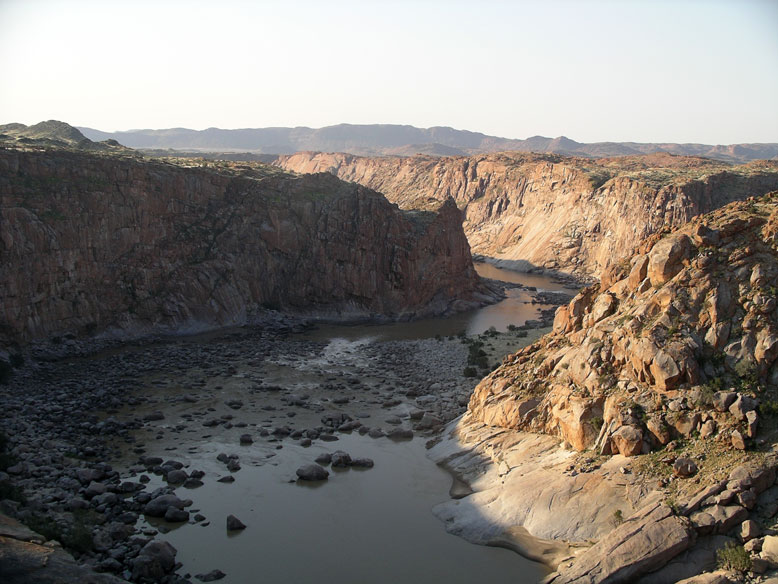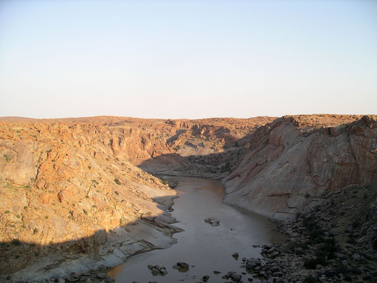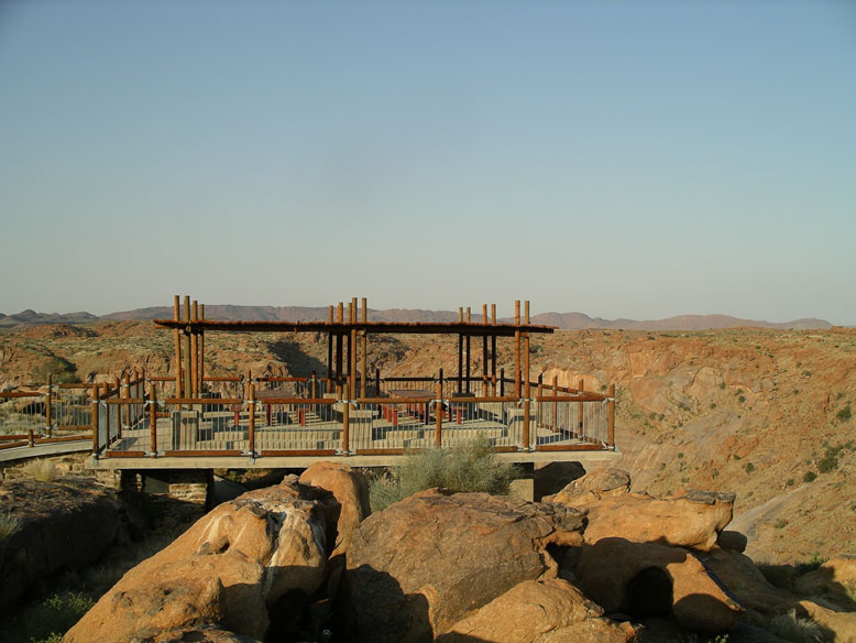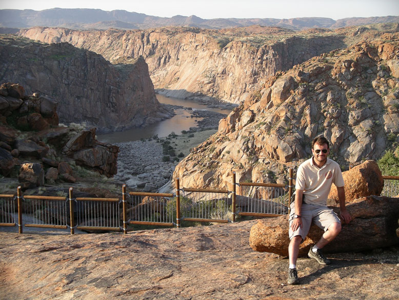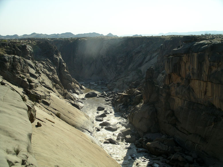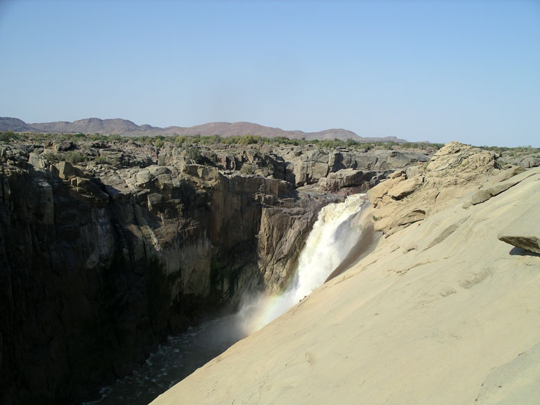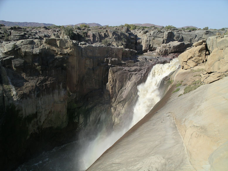 A unos 70 Kilómetros de la frontera en sentido Johanesburgo, por la N10, debes de tomar el desvio hacia el PN de Augrabies. Las pistas te adentran en un paisaje de viñedos y bodegas, de donde se elaboran los mejores caldos de Sudafrica. Augrabies viene de la palabra Aukoerbis, que los khoisanes utilizaban para significar "lugar de mucho ruido" La cascada que se divisa desde el centro de interpretación es espectacular en época seca, así que figuraros como puede ser en época de lluvias. Su recorrido a traves de pasarelas, casi todas destruidas por la crecida del río que se produjo el año pasado, te hace llegar practicamente a la misma cascada y a su gran cañón. En el centro de interpretación podréis también observar una serie de curiosas fotografías de las diferentes riadas de los últimos 100 años. Se te ponen los pelos como escarpias pensar que te puedes encontrar en una de ellas.Luego el parque tiene senderos y caminos para visitar el cañón desde diferentes puntos de vista. Fue una visita que nos encantó a los cuatro, sobre todo porque no lo esperábamos. No es un parque que se le dé gran publicidad, quizás porque no contiene la fauna que tanto vende en Sudáfrica, pero os aseguro que la visita bien merece la pena.
