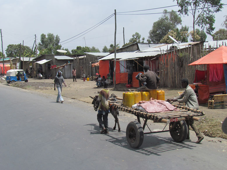 Si hay algo que falta en Etiopía es agua, no porque no llueva, pues es un país muy montañoso, sobre todo en el sur, de una vegetación frondosa, sino porque no tienen plan de recogida de aguas. Lo más característico de Etiopía es ver mareas de gente a primera hora de la mañana, con borricos, o carros, o a pie, a por agua a las bombas más proximas. así que el material mas preciado en Etiopia es el bidón amarillo de agua de 25 litros. Raro es ver un autobus o una furgoneta (matotu), o un borriquillo sin sus correspondientes garrafas de agua. Niños que antes de ir a la escuela, se cuelgan sus garrafas y van a buscar el agua requerida para ese día en su casa.