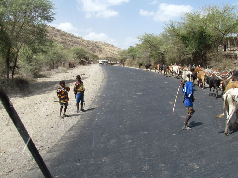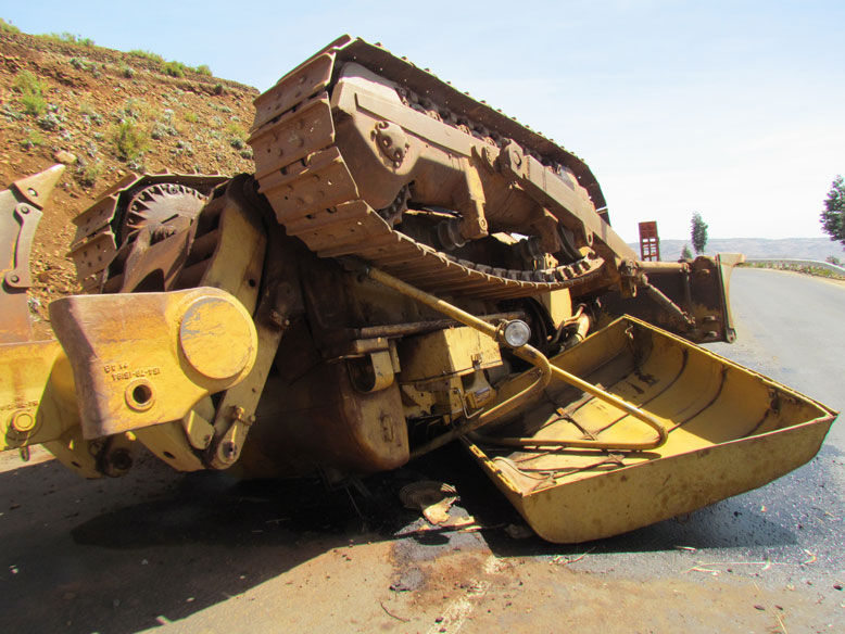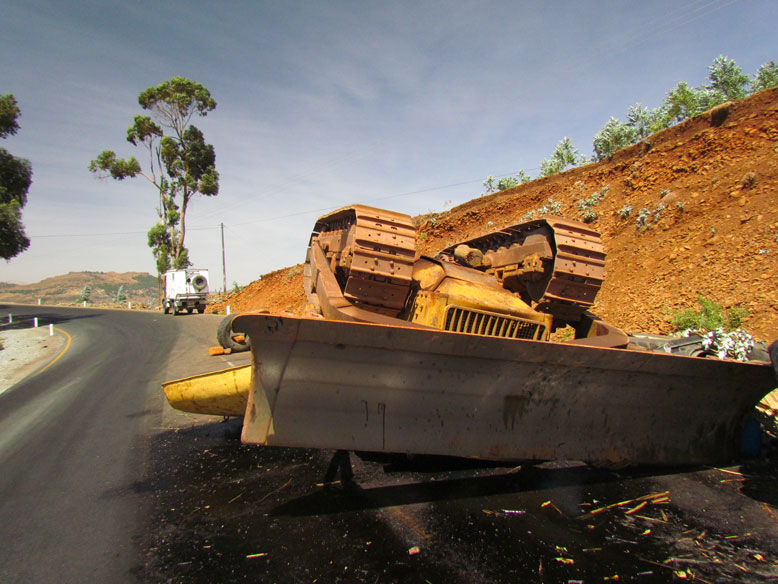 Hemos visto casi todo en la carretera, pero en esta parte del viaje además podemos incorporar a la colección mataderos improvisados en la cuneta donde descuartizaban vacas, antiguos carros de combate abandonados, probablemente del conflicto con su vecina Somalia, y hasta excavadoras rodando pendiente abajo para parar con sus restos en medio de la calzada. La carretera en Etiopia es como un gran circo, solo faltan los trapecistas.