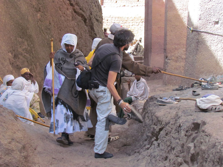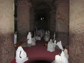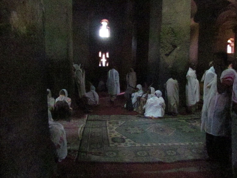 Lalibela es algo único en el planeta. No puedo decir que se trate de una cosa que te puede dejar sin respiración. En mi opinión no es así, pero si tengo que reconocer que es algo increíble que solo puedes ver en Etiopia. Es un conjunto de iglesias excavadas en el mismísimo suelo o en el interior de la roca, que te hace preguntarte como demonios pudieron hacer esto en el siglo XII con las herramientas que existían. Como todas estas cosas tiene su leyenda...que un hombre envenenado en sus últimos momentos de vida fue llevado al cielo y desde allí pudo contemplar una ciudad en la excavada en la roca , muy similar a Jerusalén, y que posteriormente fuen puesto en Etiopía para empezar su construcción". Sea verdad o no la leyenda, la verdad es que Lalibela impresiona, pero sobre todo porque se ha convertido en el primer lugar de peregrinación del país. Miles de peregrinos, vestidos con túnicas blancas visitan el recinto, buscando su salvación, el milagro y la curación. Es impresionante ver como la muchedumbre se hacina contra las pareredes de templo, rezando y ofreciendo sus plegarias. Tengo que reconocer que hay en todo esto un cierto grado de fanatismo, y esta vez no se trata de religión islámica si no cristiana.