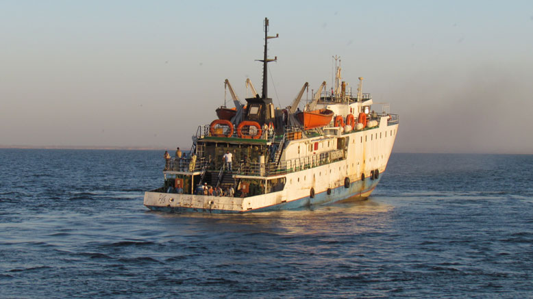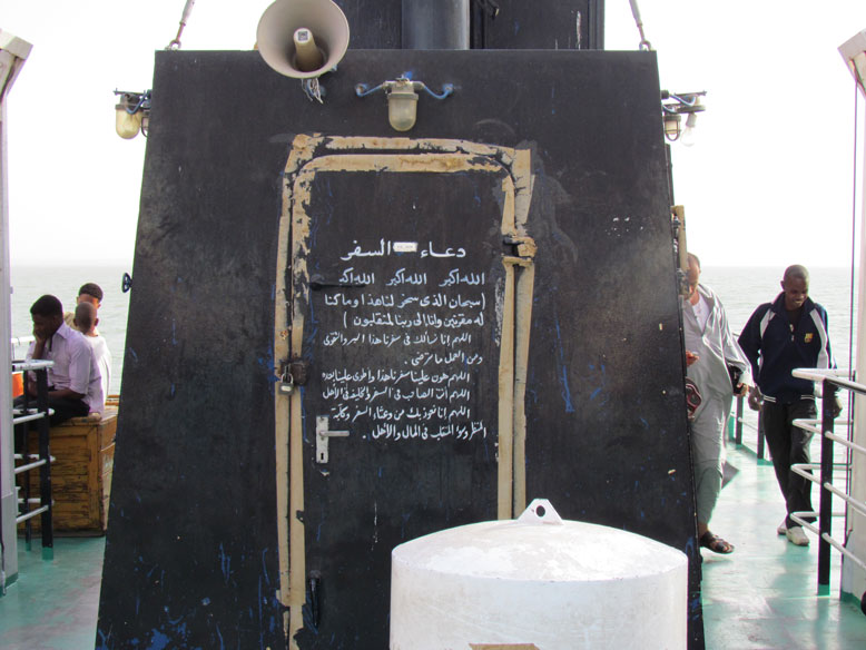 Entramos en el vetusto buque, con billete de segunda. La primera ya estaba completa. El barco es un antiguo ferry, desvencijado, viejo, muy deteriorado, con dos niveles de acomodo y una cubierta superior. En la segunda clase da pena siquiera asomar la cabeza. Bancos alargados, en los que ha desaparecido el respaldo acolchado. Aseos nauseabundos con los sumideros rotos donde el orín cae directamente al suelo y hay que hacer un esfuerzo titánico para visitar a nuestro amigo roca. Sin papeleras, con un fuerte olor a gasoil y con un mobiliario que se ha ido rompiendo y nadie ha querido ni reponer ni de arreglar. Sencillamente un barco que no cumpliría los requisitos mínimos de navegabilidad de cualquier país civilizado, pero nuevamente esto es África.