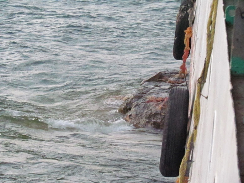 Ya las cosas empiezan a tranquilizarse y vemos que es imposible que el barco se hunda, porque esta sencillamente sobre la roca. Tratan de sacarlo con la reversa a tope de potencia del barco. Una maniobra desde mi punto de vista de lo mas desconsejada, porque si llega a tener una grieta el barco y lo hacen volver de nuevo al agua, entonces si que hubiésemos tenido un problema.