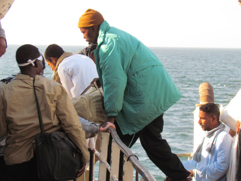 Al llegar a la pequeña terminal del puerto de Wadi Halfa, el caos es total y absoluto, lo más normal en África. Nuestro fixer nos ayuda con todos los tramites burocráticos y aduaneros. Al final nos juntamos en el mismo grupo del fixer, un español, Jordi, una francesa, dos ingleses, y dos alemanes, además de nosotros.