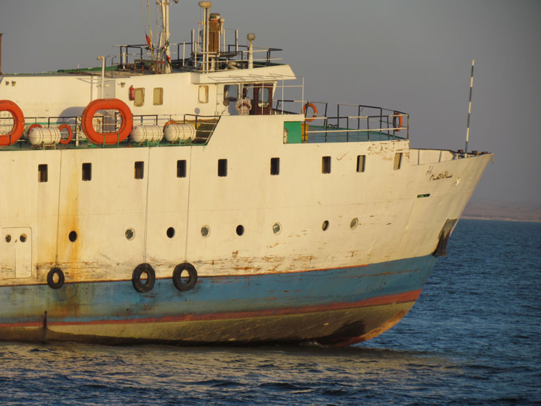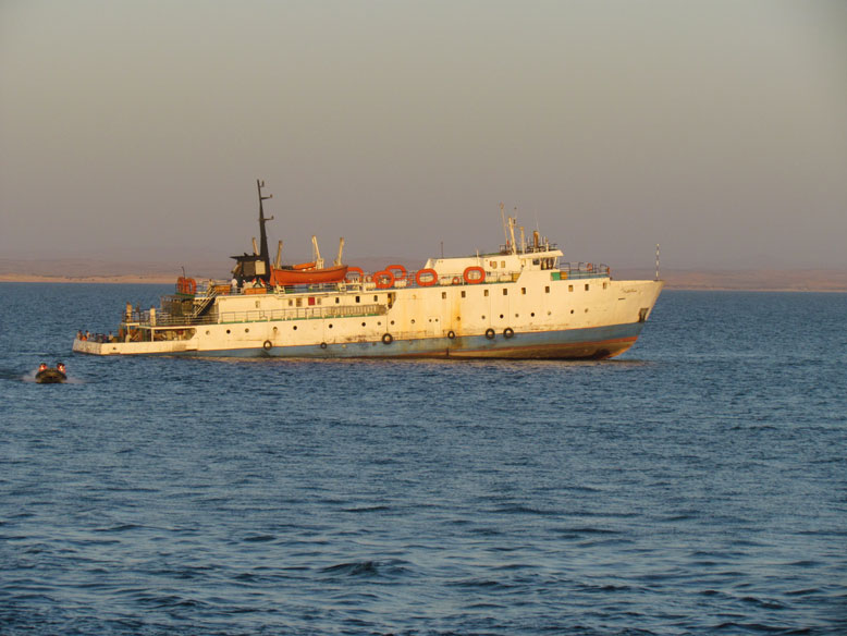 Despues de lo que se suele llamar en la mancha, una "noche toledana", parece que conciliamos los tres un poco el sueño de madrugada encima del banco que era como un cilicio, imagino fruto del agotamiento de toda la noche, que de la comodidad del mobiliario. Un impacto parecido a un arrastre de metal hace temblar todo el barco, y el ferry se detiene con una desaceleración brutal que hace que mas de uno caiga al suelo desde el banco. Son las cinco de la mañana. Me despierto sobrecogido y veo que el barco esta escorado. Enseguida me salta la alarma y me pongo las zapatillas a toda velocidad y corro a popa para echar un vistazo. Son las 05.30 de la mañana, todavía es denoche, y entre la poca luz que hay y la confusión que reina en el barco, aprecio erróneamente que la popa se estaba llenando de agua. Corro a donde estan Luis y Jorge y les comunico que probablemente hay una vía de agua y hay que salir zumbando hacia la cubierta superior. La megafonía del barco dice algo para nosotros ininteligible en árabe. La gente corre como locos cubierta arriba. Nosotros recogemos como rayos las cuatro cosas que hemos traído al barco y subimos a la cubierta. El buque esta escorado unos grados a estribor y unos grados proa arriba.