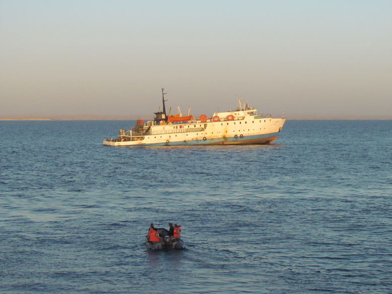 Vemos que los telefonos carecen de cobertura y sacamos el nuestro satélite. Como somos previsores, la noche anterior en Wadi Halfa lo habíamos cargado y teniamos las baterías al 100%. LLamamos al numero de la embajada de España que aparece en la guía Lonley planet, pero es erróneo. Así que de nuevo llamar a mi hermano Alfonso para que desde España, nos localice los telefonos correctos. A la tercera va la vencida y acierta con uno que es el consulado de España en Alejandría. Explicamos el problema a la secretaria y enseguida nos llama el cónsul y se pone manos a la obra con el gobierno Egipcio. Transcurre toda la mañana, dando posiciones GPS, hablando con el consulado de España en Alejandría y en el Cairo. Fianalmente todo da su fruto y nos comunica el cónsul en Alejandría que vienen los militares y un barco de rescate. La información luego es confusa porque hay también unos polacos que han hablado con su servicio diplomatico y nos dice que viene un remolcador. Al final es el servicio español el que tiene la razón. Se aproximan dos zodiac con personal militar y una hora mas tarde un barco igual al nuestro para el rescate, mas una barcaza remolcadora.
