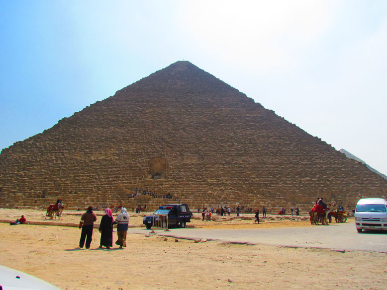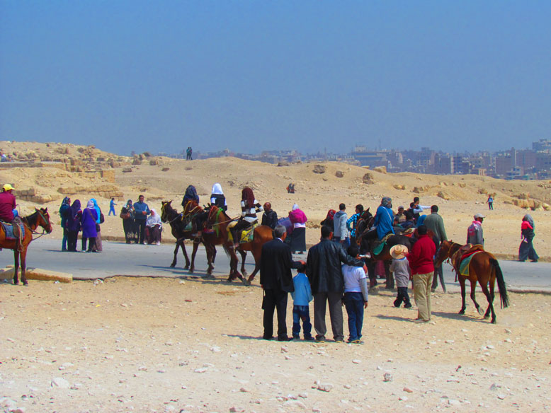 La majestuosidad de las piramides no tiene comparación alguna, pero el recinto donde estan, empaña completamente tan espléndido espectáculo. Carros a toda velocidad buscando turistas, caballos, camellos que no miran por donde vas y no respetan a nadie. Continuo acoso para ofrecer todo tipo de servicios, se meten por medio de tus fotos, te intentan timar con entradas falsas para acceder al interior de la piramide. Un espanto. Una pena que tan colosal estructura se vea tan enturbiada por ese mercado de gente y de servicios que la rodea. Lo mejor es volver la espalda a las piramides, intentar abstraerse de todo lo que te rodea y contemplar El Cairo, "la madre de todas las ciudades", como si tuviese vida propia, como si fuese un monstruo que se despereza y ruge saliendo de la cueva. Para mi, la mejor impresión de todo Egipto.