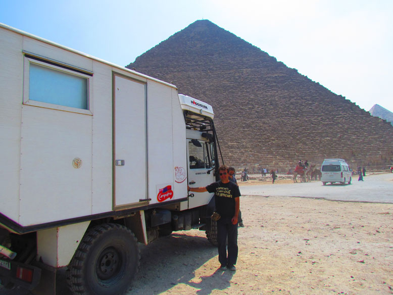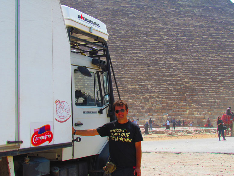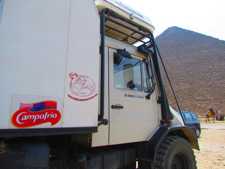 Nuestra meta son la piramides de Giza. Esta vez si llevamos el vehículo. La foto había que hacerla si o si y como no, siempre tiene que haber algún hijo de p. que te amarga la mañana y con ello desvirtuar de tan fantástico espectáculo. Los vehículos particulares extranjeros que suben al aparcamiento de las piramides son casi nulos y no te digo un camión. Casi subrealista, y claro, como dejar pasar la oportunidad para llevarse una buena tajada. No seria egipcio!!!. Al llegar a la puerta del aparcamiento, nos para la policía turística, y nos dice que antes de acceder tenemos que sacar los tikets en la caseta anexa. Pero no 3 sino cuatro, para el camión también, como si fuese una persona mas, que va a visitar las piramides. A mí me extrañó pero te lo esta diciendo la policía turística, tampoco hay que desconfiar de todo el mundo. ¡ Tremendo error si es un egipcio! Me dirijo a sacar los 4 tikets a la nada despreciable suma de 60 libras por persona (8€). Ya al llegar a la taquilla me coge un personaje y me amenaza casi de muerte si fotografío al camión con las piramides, por el logo de la web y el de campofrio, que para ello hay que sacar un permiso de fotografía especial y que si me ven tomando fotos al camión me van a detener. Tremenda farsa, lo único que quieren es que te acojones y pagues el supuesto permiso falso, pero que uno tenga que aguantar amenazas de unos don nadie a estas alturas, le jode. Casi me encaro con el, pero mejor guardar las formas en lugares donde tu eres el extranjero.