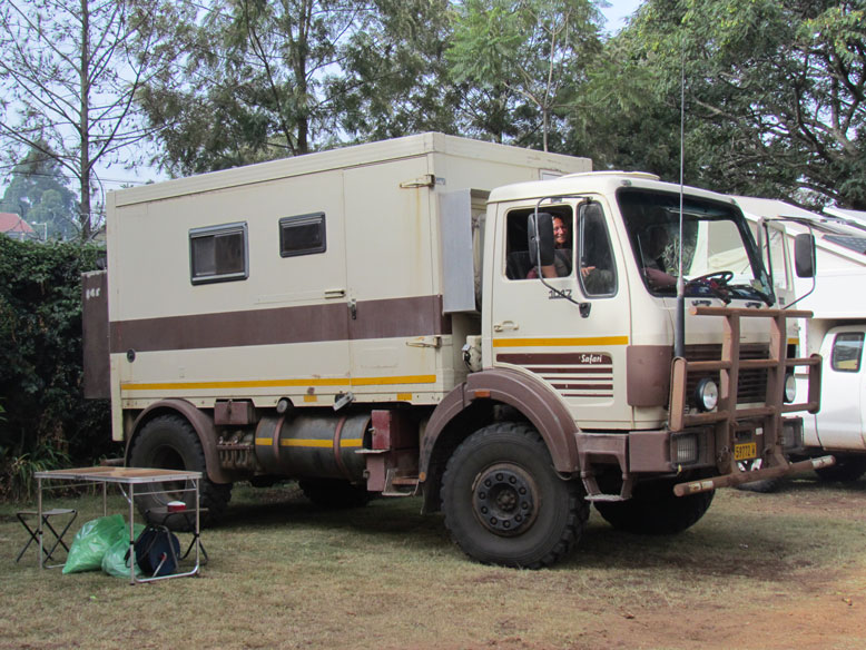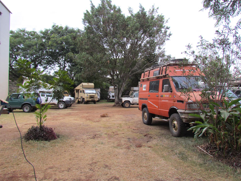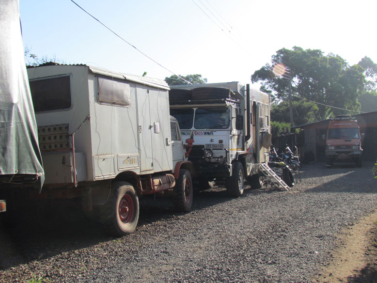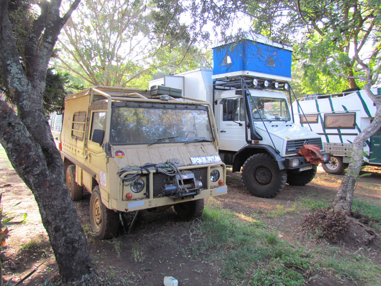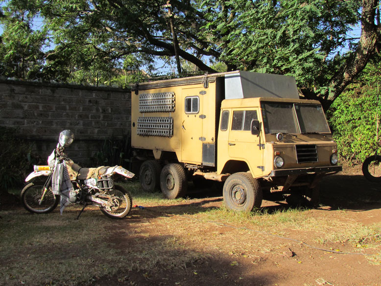 Pero Nairobi es sobre todo el ecuador de todos los overlanders, tanto los que bajan como los que suben, y eso lo ha sabido aprovechar bien Christ, un alemán que con buen olfato ha montado el Jungle Juction. Un gran camping en medio de todo Nairobi, donde nos reunimos todos los que queremos cruzar áfrica en vehículo. Ha montado el mejor reclamo, un taller a la europea, donde las colas para reparación son eternas. No dan a basto los 2 operarios que tiene en el taller. Tiene decenas de motos esperando a reparación y algún que otro land rover. También te permite dejar el vehículo guardado en el camping a un precio módico, bien porque nos has conseguido la visa etiope, o porque te tienes que ir a tu país a trabajar una temporada antes de continuar viaje. No veáis lo que disfruté en este camping, estaba en mi salsa. No había mas que hierros. Steyr Pinzgauer (que recuerdos), Volvo Laplander, Unimog´s, Samal...y como dije antes, decenas de motos de todas las nacionalidades. Porque la pista que viene desde el norte, Moyale-Nairobi, no deja vehículo vivo, sobre todo las motos, que revientan todas las suspensiones en este tramo de 500 kilometros que comenzaremos mañana.