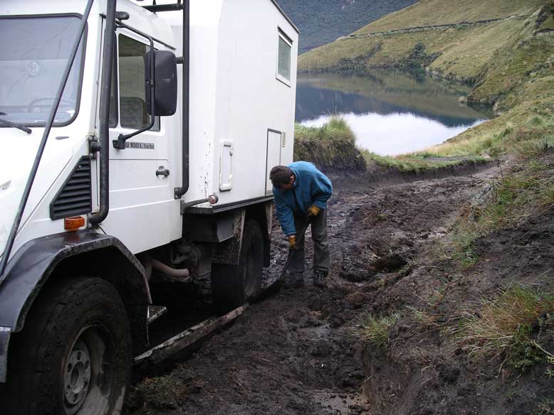 Nuestro siguiente objetivo, el mundial famoso mercado del pueblo de Otavalo, situado en plena panamaricana. Pero como íbamos a ir directos, que va, nos desviamos un poquito y nos acercanos por una pista de tierra hasta las lagunas de montaña de Mojanda a 4000 metros. Según nos vamos aproximando a la laguna, preciosa por cierto, empieza a llover de una manera torrencial, y lo que en un principio no iba a ser más que una mera excursión se empezó a complicar de verdad, hasta el punto de que cuando decidimos partir hacia Otavalo, ya fue tarde. Nos quedamos atollados en una subida del camino. Para delante era imposible y para atrás se cruzaba el camión y nos caíamos al precipicio. Estuvimos desde las 5 de la tarde hasta las 10 de la noche intentando salir del atolladero, sin éxito. Oímos unas voces al otro lado de la laguna y decidimos ir a pedir ayuda aun sabiendo que iba a ser poco efectiva evaluando la situación en la que se encontraba el camión. Despues de caminar una hora en plena noche nos encontramos un grupo de militares chilenos y ecuatorianos que estaban en una especie de maniobras. De veras que no nos hicieron ni caso, ni siquiera nos preguntaron si necesitábamos algo, cenar o dormir....., nada de nada. Igual que te encuentras gente fantástica por el camino como los del taller de Quito, también te encuentras a personajes como los de esa noche. De vuelta al camión por el mismo camino, yo invocaba a Thor(dios del trueno) por un pequeño favorcito de 300000 voltios en cierto campamento militar. No soy nada rencorosoooo!!!!!!
