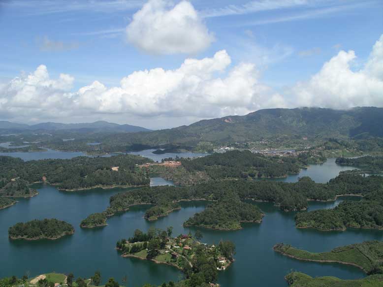 A dos horas de Medellín esta el pueblo de Guatapé. Lugar de ocio preferido de la gente de Medellín. Una zona lacustre, con numerosos islotes, hacen para el visitante,un paraíso para practicar los deportes o atracciones acuáticas. El pueblo es una delicia, es como si estuvieses paseando por un pueblecito de la Warner o de Eurodisney. Todas las fachas de las casas estan decoradas con vivos colores y en la parte inferior bajo relieves de lo más originales. Pero la atracción fundamental del pueblo es subir a su Peñól o Peña. Yo cuando lo vi, creía que estábamos en Gibraltar.....Algun día español!!!...... un monolito de granito de 200 metros de altura, junto al lago, hace de atalaya para divisar las estupendas vistas del lugar. 650 peldaños que se hacen durillos. Eso sí, han plantado un torreón de ladrillo, sin ni siquiera enfoscar, que se carga por completo el entorno y por lo hablar de los dos chiringuitos, también en la cumbre, que no paran de reventarte los tímpanos a son de requetón.
