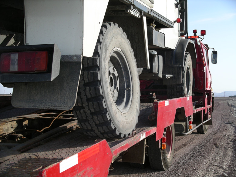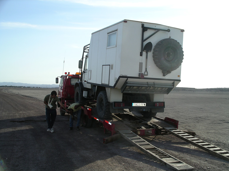 Pero, está claro, que la suerte no ha sido nuestra aliada en este viaje. Cuando faltaban 250kms para llegar a la frontera con Perú, se gripa el rodamiento del semieje trasero derecho. Ahora si que se acabó de verdad . Yo mutilado y la rueda trasera izquierda gripada, sólo me quedaban dos opciones, tirarme por un barranco o que me atropellase un coche. Al final opté por otra opción. Paramos un coche que nos trasladó amablemente a la ciudad de Iquique, distante 70 kms, para buscar un camión plataforma. Afortunadamente en Iquique, había sevicio oficial Mercedes Benz, Así que nuestro niño, se quedó allí, mientras nosotros, replanteábamos por enésima vez el viaje, volando desde Iquique a Santiago de Chile y, desde allí, a Madrid.