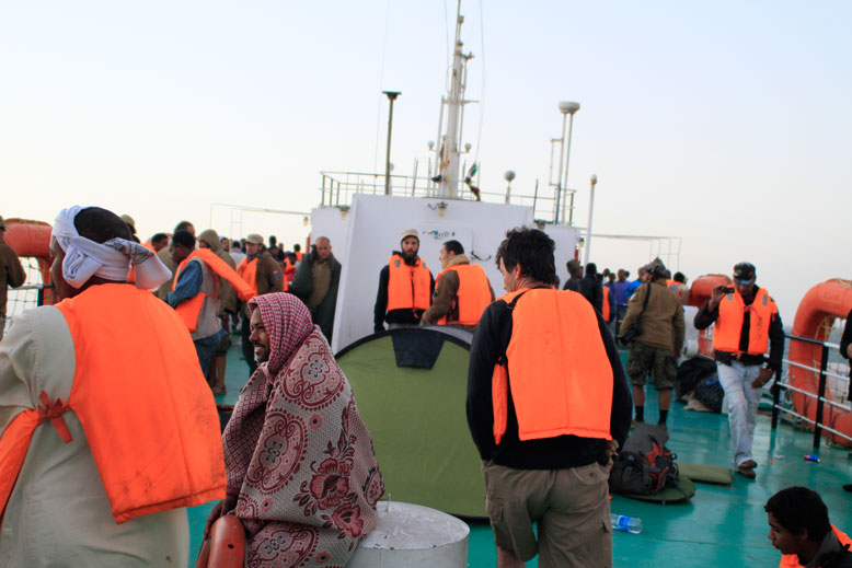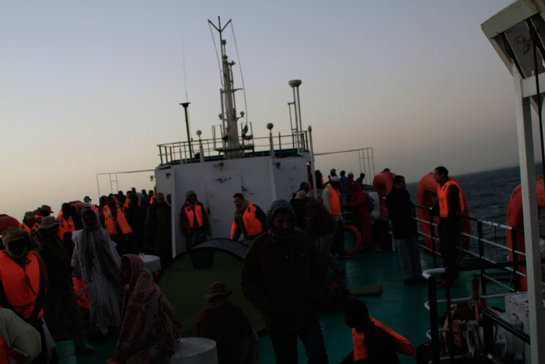 Despues de lo que se suele llamar en la mancha, una "noche toledana", parece que conciliamos los tres un poco el sueño de madrugada encima del banco que era como un cilicio, imagino fruto del agotamiento de toda la noche, que de la comodidad del mobiliario. Un impacto parecido a un arrastre de metal hace temblar todo el barco, y el ferry se detiene con una desaceleración brutal que hace que mas de uno caiga al suelo desde el banco. Son las cinco de la mañana. Me despierto sobrecogido y veo que el barco esta escorado. Enseguida me salta la alarma y me pongo las zapatillas a toda velocidad y corro a popa para echar un vistazo. Son las 05.30 de la mañana, todavía es denoche, y entre la poca luz que hay y la confusión que reina en el barco, aprecio erróneamente que la popa se estaba llenando de agua. Corro a donde estan Luis y Jorge y les comunico que probablemente hay una vía de agua y hay que salir zumbando hacia la cubierta superior. La megafonía del barco dice algo para nosotros ininteligible en árabe. La gente corre como locos cubierta arriba. Nosotros recogemos como rayos las cuatro cosas que hemos traído al barco y subimos a la cubierta. El buque esta escorado unos grados a estribor y unos grados proa arriba.