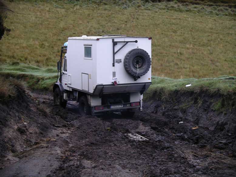 Nuestro siguiente objetivo, el mundial famoso mercado del pueblo de Otavalo, situado en plena panamaricana. Pero como íbamos a ir directos, que va, nos desviamos un poquito y nos acercanos por una pista de tierra hasta las lagunas de montaña de Mojanda a 4000 metros. Según nos vamos aproximando a la laguna, preciosa por cierto, empieza a llover de una manera torrencial, y lo que en un principio no iba a ser más que una mera excursión se empezó a complicar de verdad, hasta el punto de que cuando decidimos partir hacia Otavalo, ya fue tarde. Nos quedamos atollados en una subida del camino. Para delante era imposible y para atrás se cruzaba el camión y nos caíamos al precipicio. Estuvimos desde las 5 de la tarde hasta las 10 de la noche intentando salir del atolladero, sin éxito. Oímos unas voces al otro lado de la laguna y decidimos ir a pedir ayuda aun sabiendo que iba a ser poco efectiva evaluando la situación en la que se encontraba el camión. Despues de caminar una hora en plena noche nos encontramos un grupo de militares chilenos y ecuatorianos que estaban en una especie de maniobras. De veras que no nos hicieron ni caso, ni siquiera nos preguntaron si necesitábamos algo, cenar o dormir....., nada de nada. Igual que te encuentras gente fantástica por el camino como los del taller de Quito, también te encuentras a personajes como los de esa noche. De vuelta al camión por el mismo camino, yo invocaba a Thor(dios del trueno) por un pequeño favorcito de 300000 voltios en cierto campamento militar. No soy nada rencorosoooo!!!!!!