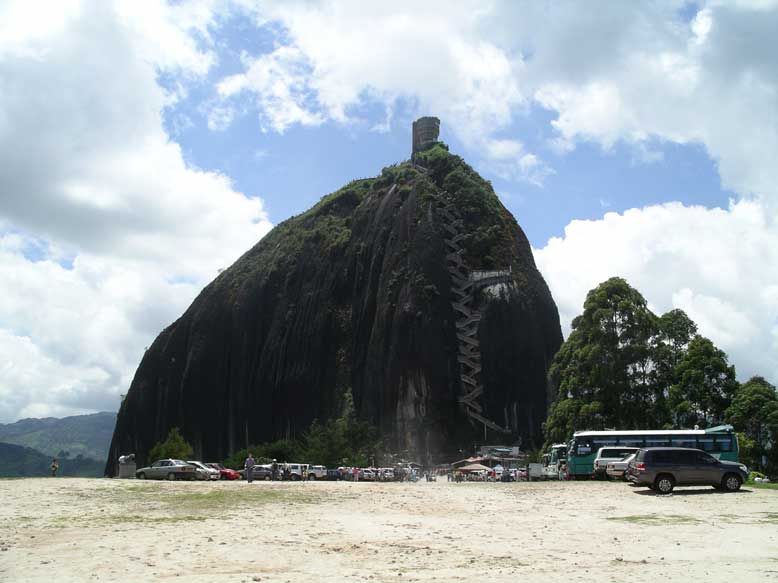 A dos horas de Medellín esta el pueblo de Guatapé. Lugar de ocio preferido de la gente de Medellín. Una zona lacustre, con numerosos islotes, hacen para el visitante,un paraíso para practicar los deportes o atracciones acuáticas. El pueblo es una delicia, es como si estuvieses paseando por un pueblecito de la Warner o de Eurodisney. Todas las fachas de las casas estan decoradas con vivos colores y en la parte inferior bajo relieves de lo más originales. Pero la atracción fundamental del pueblo es subir a su Peñól o Peña. Yo cuando lo vi, creía que estábamos en Gibraltar.....Algun día español!!!...... un monolito de granito de 200 metros de altura, junto al lago, hace de atalaya para divisar las estupendas vistas del lugar. 650 peldaños que se hacen durillos. Eso sí, han plantado un torreón de ladrillo, sin ni siquiera enfoscar, que se carga por completo el entorno y por lo hablar de los dos chiringuitos, también en la cumbre, que no paran de reventarte los tímpanos a son de requetón.