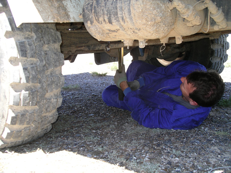 Durante estos días hemos aprovechado para apretar y quitarnos de encima este tramo, lo antes posible. Ya como viene siendo un clásico en estos viajes me he tenido que enfundar el mono, para ajustar los anclajes pivotantes de la caja, y echar un cordón de soldadura. Parece que no podemos vivir sin ello...